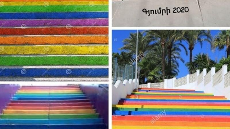 Վերջերս Գյումրի քաղաքի գետնանցումներից մեկի աստիճանները տարօրինակ պայմաններում դարձել են բազմերանգ և գույների հաջորդականությունը երջանիկ պատահականությամբ համընկնում է ԼԳԲՏ-ների դրոշի գույների հետ, որոնք ի դեպ, երևի թե ունեն իրենց նշանակությունը։ Կոչ եմ անում Գյումրու համայնքապետարան -ին և այն անձանց, ովքեր մտահոգ են իրենց զավակների ապագայով, պայքարել նմանատիպ վտանգավոր, պիղծ երևույթների և խմբավորումների դեմ՝ մաքրելով քաղաքը «գունավոր վտանգներից»։