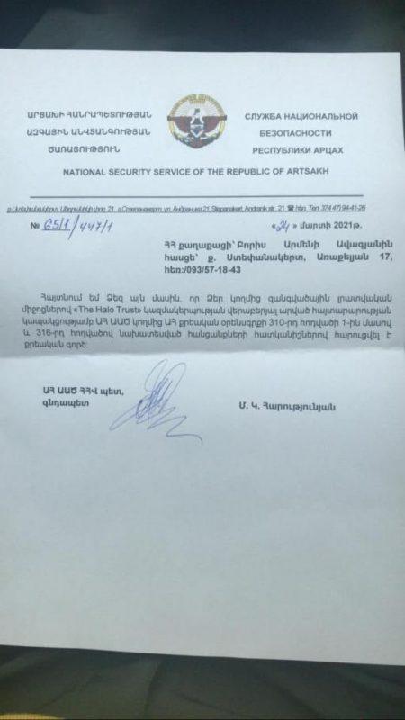 «Հայտնում ենք Ձեզ այն մասին, որ Ձեր կողմից զանգվածային լրատվամիջոցներով «The Halo Trust» կազմակերության վերաբերյալ արված հայտարարության կապակցությամբ ԱՀ ԱԱԾ-ի կողմից ԱՀ քրեական օրենսգրքի 310-րդ հոդվածի առաջին մասով և 316-րդ հոդվածով նախատեսված հանցանքների հատկանիշներով հարուցվել է քրեական գործ»,-նշվում է ԱՀ ԱԱԾ ՀՀՎ պետ Մ․ Կ․ Հարությունյանի կողմից մակագրված ծանուցման մեջ։