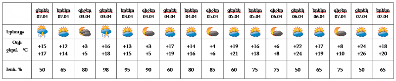 Ապրիլի 02-ի ցերեկը, 03-ին առանձին շրջաններում սպասվում են կարճատև տեղումներ, հնարավոր է ամպրոպ: