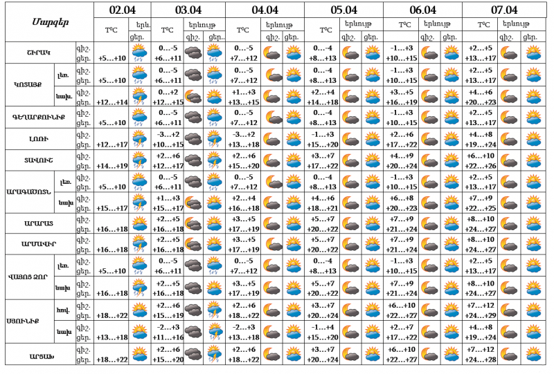 Արաբական թերակղզուց արևադարձային տաք օդի ալիքի ներթափանցմամբ պայմանավորված ապրիլի 4-7-ին օդի ջերմաստիճանը հանրապետության ողջ տարածքում աստիճանաբար կբարձրանա 8-10 աստիճանով։ Սյունիքի հովտային գոտում արդեն ապրիլի 7-ին օդի ջերմաստիճանը ցերեկային ժամերին կհասնի +26…+29, Արարատյան դաշտում և Երևանում +24…+27 աստիճանի։