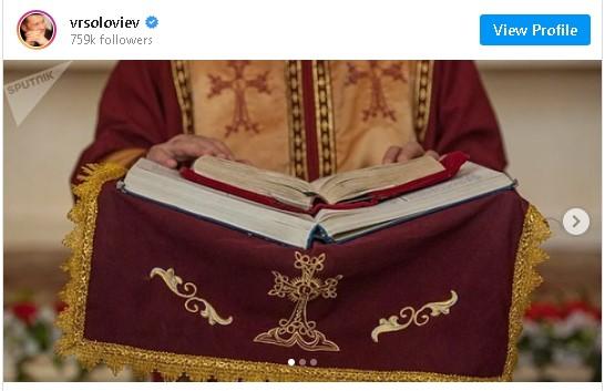 Ռուս հայտնի հաղորդավար Վլադիմիր Սոլովյովը հայերենով գրառում է արել Instagram-ի իր էջում ու շնորհավորել Հայ առաքելական եկեղեցու հետևորդներին Հիսուս Քրիստոսի հրաշափառ հարության՝ Սուրբ Զատկի տոնի կապակցությամբ։