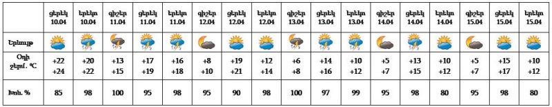 Ապրիլի 10-ի երեկոյան ժամերին, 11-ին, 13-14-ը սպասվում է կարճատև անձրև և ամպրոպ: Ապրիլի 12-ին, 15-ին սպասվում է առանց տեղումների եղանակ: Ապրիլի 10-11-ը սպասվում է քամու ուժգնացում՝ 17-22 մ/վ։