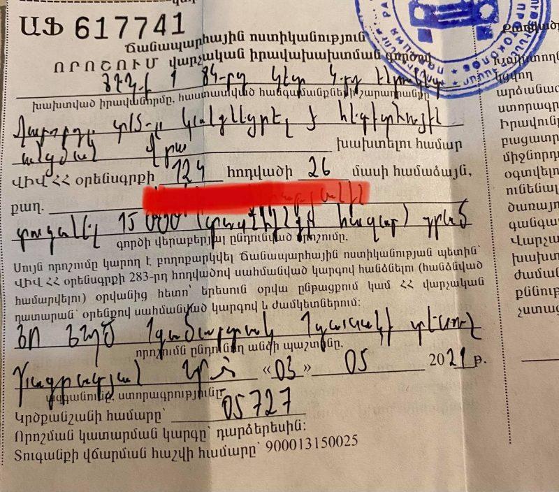 Քանի որ որոշ լրատվամիջոցներ կարևորել են այդ «դեպքը» և վերահրապարակել իրենց մոտ, շահարկումները կանխելու համար անհրաժեշտ եմ համարում տեղեկացնել, որ ՃՈ կողմից կազմվել է համապատասխան արձանագրություն, և վարորդս տեղում վճարել է տուգանքը։