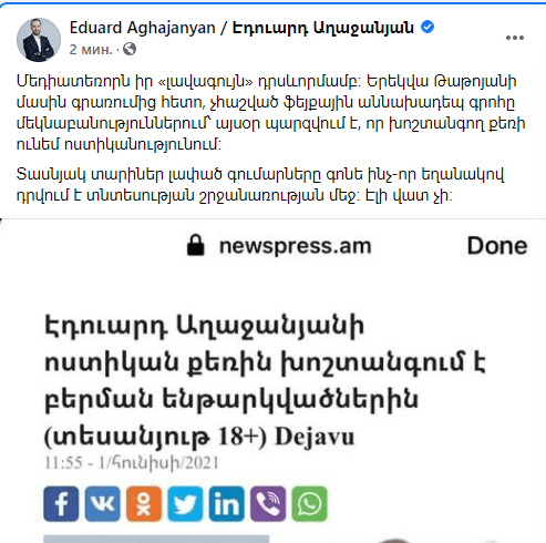 Մեդիատեռորն իր «լավագույն» դրսևորմամբ։ Երեկվա Թաթոյանի մասին գրառումից հետո, չհաշված ֆեյքային աննախադեպ գրոհը մեկնաբանություններում՝ այսօր պարզվում է, որ խոշտանգող քեռի ունեմ ոստիկանությունում։
