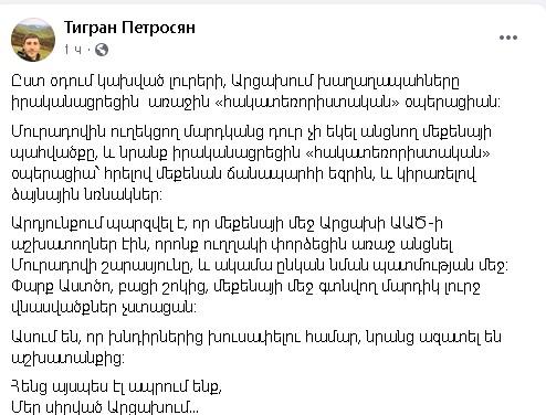 Արդյունքում պարզվել է, որ մեքենայի մեջ Արցախի ԱԱԾ-ի աշխատողներ էին, որոնք ուղղակի փորձեցին առաջ անցնել Մուրադովի շարասյունը, և ակամա ընկան նման պատմության մեջ։ Փարք Աստծո, բացի շոկից, մեքենայի մեջ գտնվող մարդիկ լուրջ վնասվածքներ չստացան։