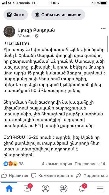 Ալեն Սիմոնյանը ֆեյսբուքյան իր էջում գրում է.