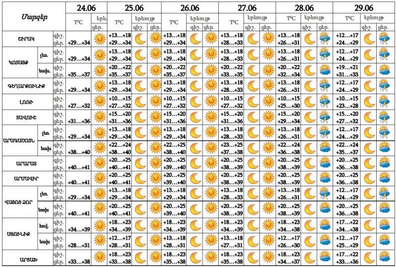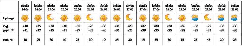 Պայմանավորված արաբական անապատներից արևադարձային տաք օդային հոսանքների ներթափանցմամբ հունիսի 24-28-ը հանրապետության ողջ տարածքում սպասվում է խիստ բարձր ջերմային ֆոն, Արարատյան դաշտում և նրա նախալեռներում, Վայոց Ձորի նախալեռներում, Սյունիքի հովտային գոտում և Երևանում ցերեկային ժամերին սպասվում է +39…+40 աստիճան։ Հունիսի 24-29-ը նշված գոտիներում սպասվում է նաև բարձր կարգի հրդեհավտանգ իրավիճակ: Ուլտրամանուշակագույն ճառագայթման ինտենսիվությունը սպասվում է նորմայից բարձր։ Խորհուրդ է տրվում ժամը 11։00-ից մինչև 17։00-ն ընկած ժամանակահատվածում խուսափել արևի ուղիղ ճառագայթներից։