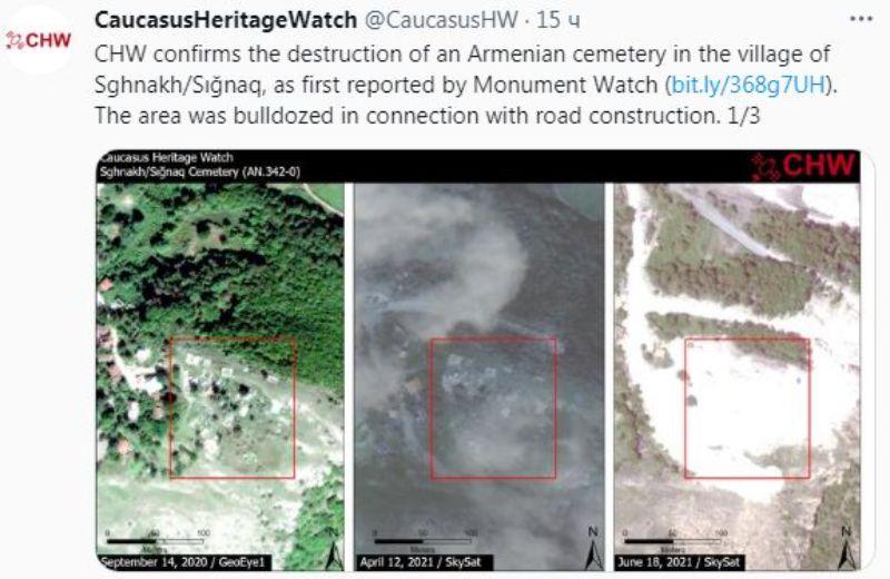 «Կովկասյան ժառանգության պաշտպանության կազմակերպությունը հաստատում է Սղնախ գյուղի հայկական գերեզմանոցի ավերածության փաստը, որի մասին առաջինը զեկուցել էր Հուշարձանների պաշտպանության կազմակերպությունը: Այդ տարածքը ավերվել է ճանապարհային շինարարության նպատակով»,- նշվում է գրառման մեջ:
