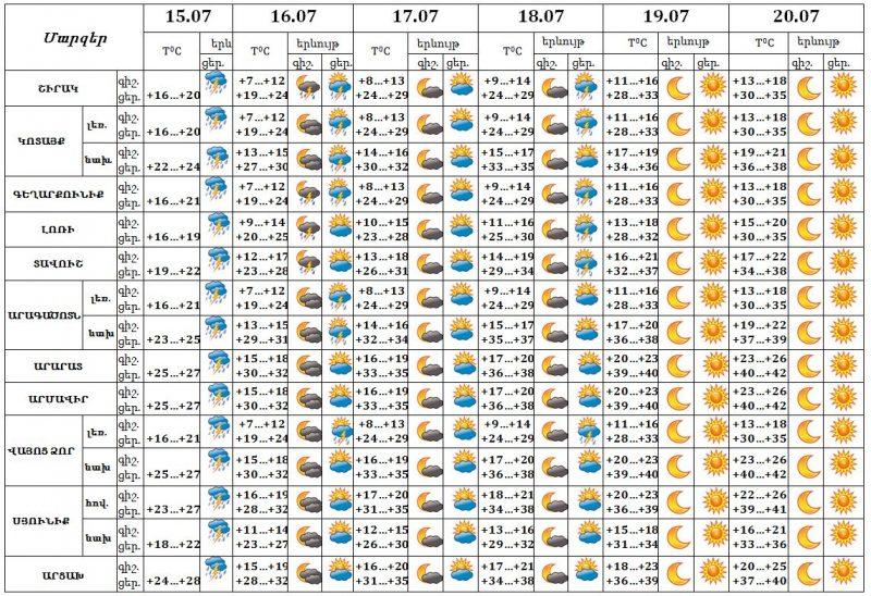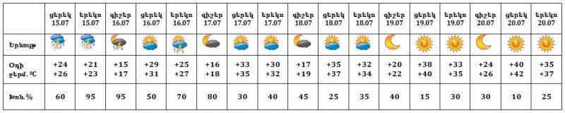 Հուլիսի 15-ի ցերեկը շրջանների զգալի մասում, 16-ին, 18-ի կեսօրից հետո առանձին շրջաններում սպասվում է անձրև և ամպրոպ, առանձին հատվածներում` նաև կարկուտ։ Հուլիսի 17-ին, 19-20-ը սպասվում է առանց տեղումների եղանակ: