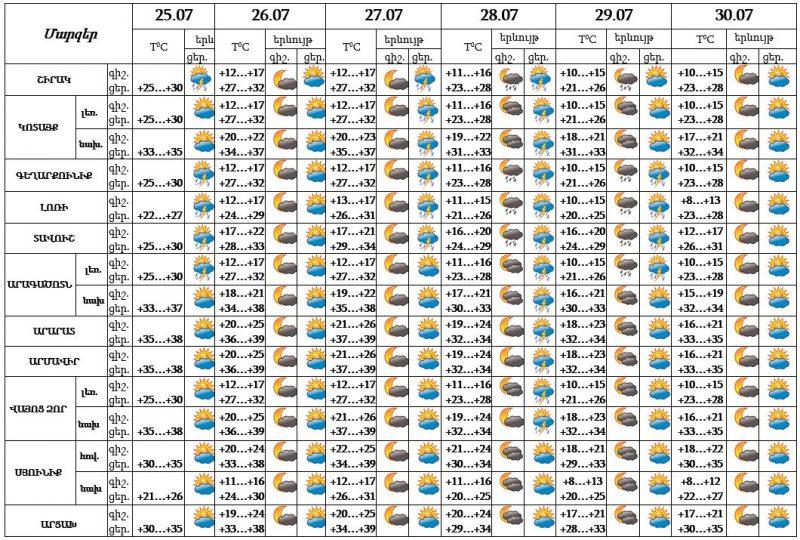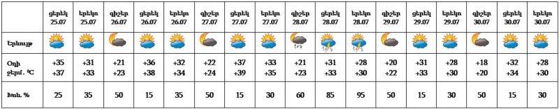 Հուլիսի 25-ի ցերեկը, 26-27-ը, 29-30-ը սպասվում է առանց տեղումների եղանակ: Հուլիսի 28-ին ժամանակ առ ժամանակ սպասվում է կարճատև անձրև և ամպրոպ, ամպրոպի ժամանակ հնարավոր է քամու ուժգնացում՝ 18-20 մ/վ արագությամբ: