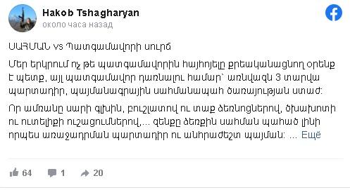 Մեր երկրում ոչ թե պատգամավորին հայհոյելը քրեականացնող օրենք է պետք, այլ պատգամավոր դառնալու համար` առնվազն 3 տարվա պարտադիր, պայմանագրային սահմանապահ ծառայության ստաժ: