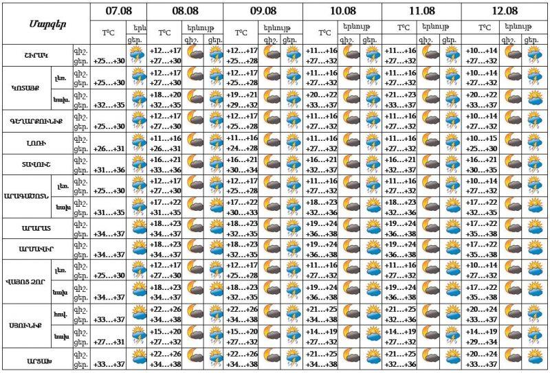 Օգոստոսի 7-ի ցերեկը, 8-ին, 10-12-ն առանձին շրջաններում, 9-ին՝ շրջանների զգալի մասում կեսօրից հետո, սպասվում է անձրև և ամպրոպ, առանձին հատվածներում հնարավոր է նաև կարկուտ։