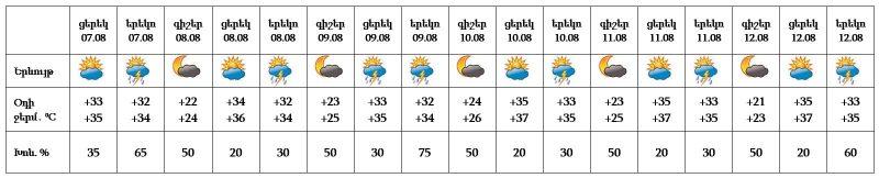 Օգոստոսի 7-12-ը՝ երեկոյան ժամերին, առանձին հատվածներում սպասվում է կարճատև անձրև և ամպրոպ, ամպրոպի ժամանակ հնարավոր է քամու ուժգնացում՝ 18-20 մ/վ արագությամբ: