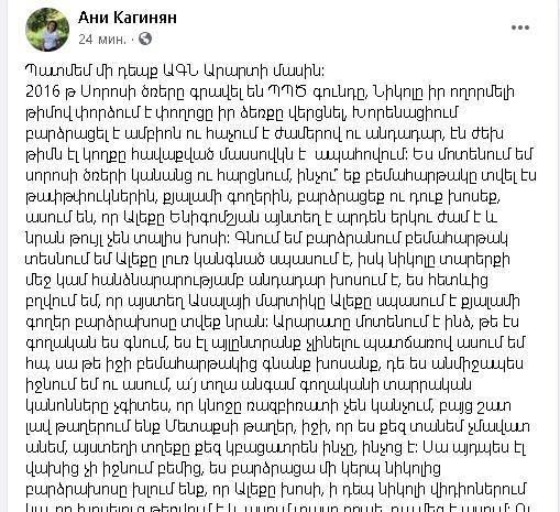 Անի Կաղինյանը ֆեյսբուքյան իր էջում գրում է