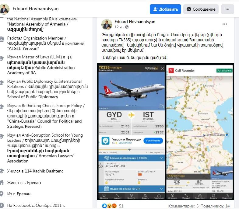 «Թուրքական ավիաուղիների Բաքու-Ստամբուլ չվերթը (չվերթի համարը ТК335) այսօր առաջին անգամ թռավ Հայաստանի տարածքով: Նախկինում նա Սև ծովով Վրաստանի տարածքով Ստամբուլ էր մեկնում: Անկեղծ ասած, ես զարմացած չեմ»։