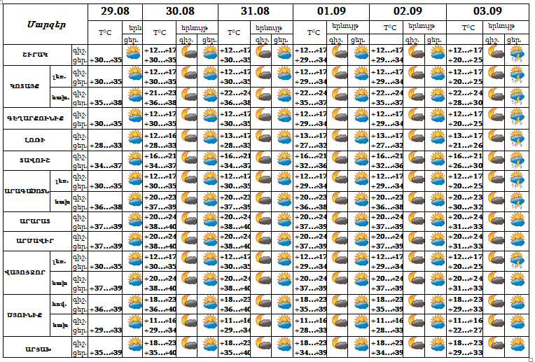 Օգոստոսի 29-ի ցերեկը, 30-31-ին, սեպտեմբերի 01-03-ին սպասվում է առանց տեղումների եղանակ:
