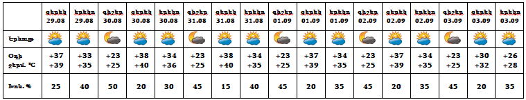 Օգոստոսի 29-ի ցերեկը, 30-31-ին, սեպտեմբերի 01-02-ին սպասվում է առանց տեղումների եղանակ: Սեպտեմբերի 03-ին կեսօրից հետո առանձին շրջաններում սպասվում է կարճատև անձրև և ամպրոպ, առանձին հատվածներում հնարավոր է նաև կարկուտ: Քամին հարավ-արևմտյան՝ 5-10մ/վրկ, ամպրոպի ժամանակ սպասվում է քամու ուժգնացում 18-23մ/վրկ արագությամբ։ Օդի ջերմաստիճանն օգոստոսի 29-30-ին ցերեկն աստիճանաբար կբարձրանա 2-3 աստիճանով, սեպտեմբերի 03-ի ցերեկը կնվազի 6-8 աստիճանով: