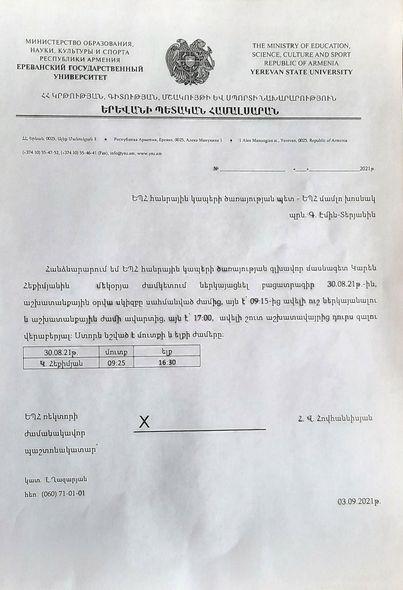ԵՊՀ-ում սկսվեց հետապնդումը: Ուրեմն, բուհի ռեկտորի այսրոպեական ժ.պ. Հ.Հ.-ն, կատարող, միաժամանակ քարտուղարուհի Ղազարյան Լուսինեի հետ միասին հետևում են իրենց համար անցանկալի անձանց: Վերջիններիս հետաքրքրության շրջանակում են իմ՝ ԵՊՀ մուտքի և ելքի ժամերը: Ի՞նչ ձևաչափով է տանդեմն իրականացնում անցանկալի անձանց հետևելու գործընթացը՝ անհայտ է: