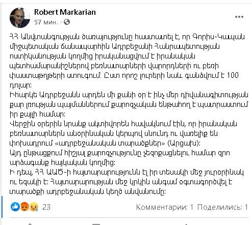 Վերջին օրերին նրանք ակտիվորեն հավակնում էին, որ իրանական բեռնատարներն անօրինական կերպով սնունդ ու վառելիք են փոխադրում «ադրբեջանական տարածքներ» (Արցախ):