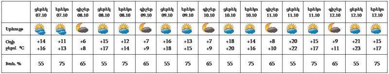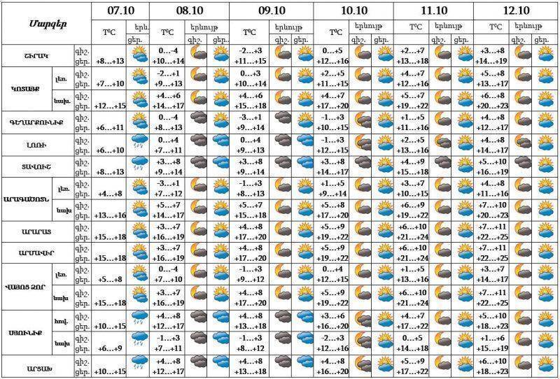 Հոկտեմբերի 7-ի ցերեկը Լոռիում, Տավուշում, Սյունիքում և Արցախում սպասվում են տեղումներ: Հոկտեմբերի 8-12-ը սպասվում է առանց տեղումների եղանակ։