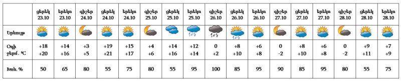 Հոկտեմբերի 23-ի ցերեկը, 24-ին, 25-ի գիշերը, 27-28-ը սպասվում է առանց տեղումների եղանակ։ Հոկտեմբերի 25-ի երեկոյան ժամերին և 26-ին սպասվում է անձրև: