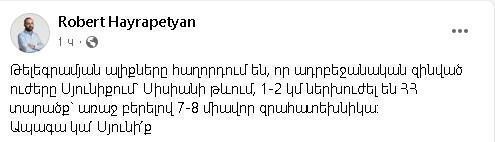 Թելեգրամյան ալիքները հաղորդում են, որ ադրբեջանական զինված ուժերը Սյունիքում` Սիսիանի թևում, 1-2 կմ ներխուժել են ՀՀ տարածք` առաջ բերելով 7-8 միավոր զրահատեխնիկա։