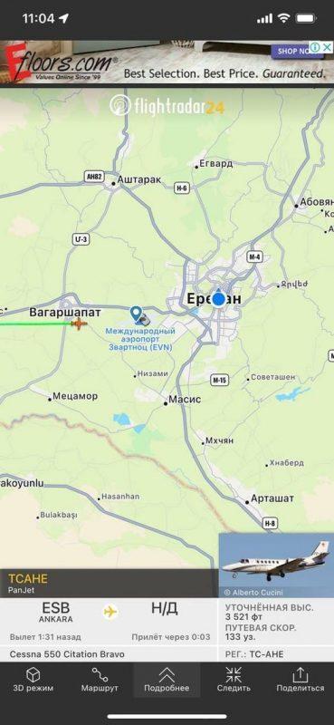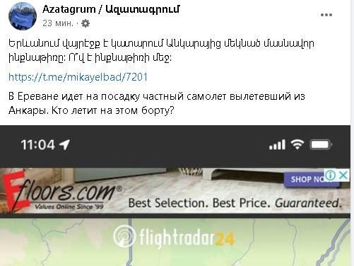 Ազատագրում ֆեյսբուքյա էջը թռիչքների քարտեզ է տեղադրել ու գրել՝ Երևանում վայրէջք է կատարում Անկարայից մեկնած մասնավոր ինքնաթիռը: Ո՞վ է ինքնաթիռի մեջ: