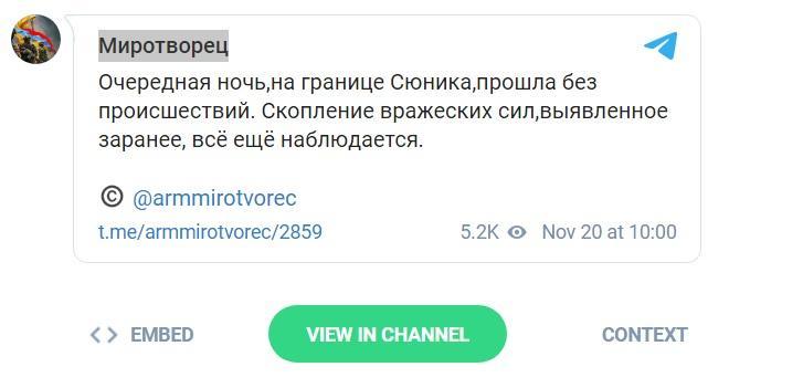 «Миротворец» թելեգրամյան ալիքը տեղեկացնում է, որ գիշերը Սյունիքի սահմանին անցել է առանց միջադեպերի, սակայն դեռևս նկատվում է հակառակորդի կողմից ուժերի կուտակումը։
