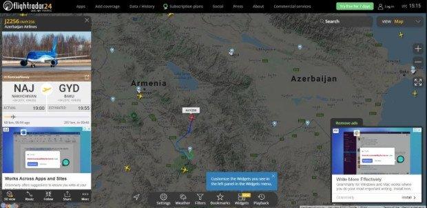Flightradar24.com-ի ստացած տվյալներից երեւում է, որ ինքնաթիռը թռել է Վայոց ձորի մարզում Ջերմուկի, Գեղարքունիքի մարզում Վարդենիսի, ինչպես նաեւ Արցախի օկուպացված տարածքների վրայով, այնուհետեւ ուղեւորվել Բաքու։