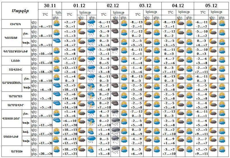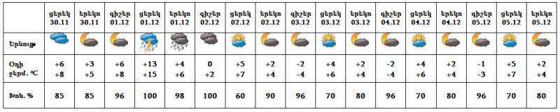 Նոյեմբերի 30-ի ցերեկը, դեկտեմբերի 1-ի գիշերը սպասվում է առանց տեղումների եղանակ: Դեկտեմբերի 1-ի ցերեկը շրջանների զգալի մասում, 2-ի գիշերը առանձին շրջաններում սպասվում են տեղումներ, լեռնային և նախալեռնային շրջաններում ձյան տեսքով: Քամին՝ հարավ-արևելյան` 2-5 մ/վ, նոյեմբերի 30-ին և դեկտեմբերի 1-ին առանձին շրջաններում սպասվում է քամու ուժգնացում` 20-25 մ/վ: Օդի ջերմաստիճանը դեկտեմբերի 1-ի ցերեկը հյուսիսային շրջաններում կնվազի 10-12 աստիճանով, Արարատյան դաշտում կբարձրանա 8-10 աստիճանով, դեկտեմբերի 2-3-ը` հատկապես գիշերային ժամերին, կնվազի 7-10 աստիճանով։
