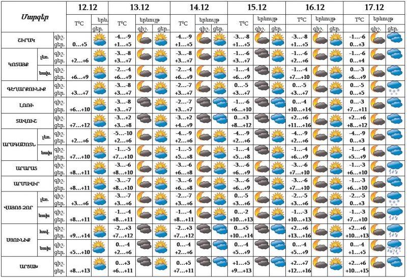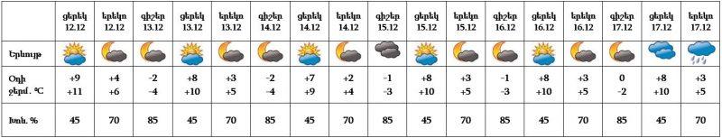 Դեկտեմբերի 12-ի ցերեկը, 13-16-ը սպասվում է առանց տեղումների եղանակ: Գիշերը և առավոտյան ժամերին լեռնային և նախալեռնային գոտիներում ճանապարհները կպատվեն մերկասառույցով, Արարատյան դաշտում առավոտյան ժամերին հնարավոր է մառախուղ: Դեկտեմբերի 17-ին կեսօրից հետո առանձին շրջաններում սպասվում են տեղումներ: