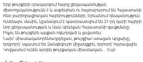Այդ դրածոները լծված են Հայ ժողովրդին մանիպուլյատիվ մեթոդներով մոլորեցնելու գործին՝ ինտենսիվորեն բարբաջելով թուրքի հետ կոմունիկացիաների բացման, առևտրի, թշնամանքի ավարտի, խաղաղության և այլ ստերի մասին: