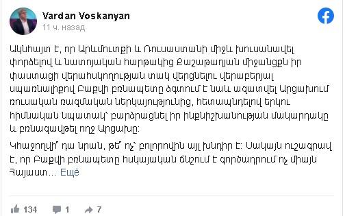 Ակնհայտ է, որ Արևմուտքի և Ռուսաստանի միջև խուսանավել փորձելով և նատոյական հարթակից Քաշաթաղյան միջանցքն իր փաստացի վերահսկողության տակ վերցնելու վերաբերյալ սպառնալիքով Բաքվի բռնապետը ձգտում է նաև ազատվել Արցախում ռուսական ռազմական ներկայությունից, հետապնդելով երկու հիմնական նպատակ՝ բարձրացնել իր ինքնիշխանության մակարդակը և բռնազավթել ողջ Արցախը։ Այս մասին Facebook-ի իր էջում գրել է «Հայրենիք» կուսակցության անդամ, իրանագետ Վարդան Ոսկանյանը: