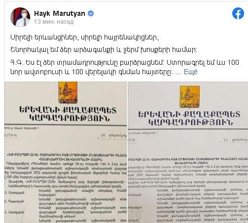 Հ.Գ. Ես էլ ձեր տրամադրությունը բարձրացնեմ։ Ստորագրել եմ ևս 100 նոր ավտոբուսի և 100 վերելակի գնման հայտերը։