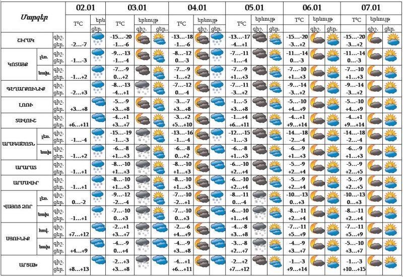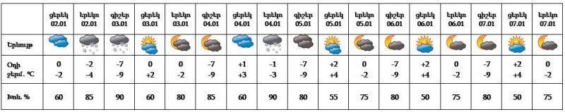 ՀՀ տարածքում` հունվարի 2-ի և 4-ի երեկոյան ժամերին, 3-ի և 5-ի գիշերը առանձին շրջաններում սպասվում է թույլ ձյուն: Հունվարի 3-ի ցերեկը, 4-ի գիշերը, 5-ի ցերեկը, 6-7-ը սպասվում է առանց տեղումների եղանակ: