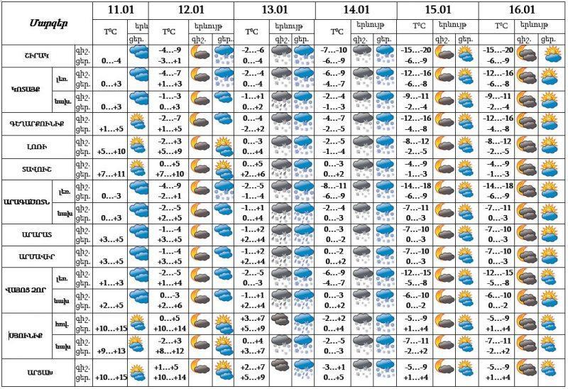 Հունվարի 11-ի ցերեկը, 12-ի գիշերը, 15-16-ը սպասվում է առանց տեղումների եղանակ: Հունվարի 12-ին երեկոյան ժամերին առանձին շրջաններում, 13-14-ին շրջանների զգալի մասում սպասվում են տեղումներ և մառախուղ, 13-ին լեռնային և նախալեռնային, 14-ին բոլոր շրջաններում` ձյան տեսքով: