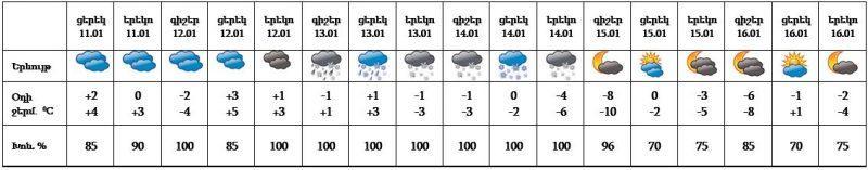 Հունվարի 11-ի ցերեկը, 12-ին, 15-16-ը սպասվում է առանց տեղումների եղանակ: Հունվարի 13-ին, 14-ին սպասվում են տեղումներ և մառախուղ, 13-14-ը թաց ձյան տեսքով: