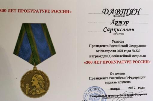 Ռուսաստանի Դաշնության նախագահ Վլադիմիր Պուտինի 2021թ. ապրիլի 20-ի հրամանով Հայաստանի Հանրապետության գլխավոր դատախազ Արթուր Դավթյանը երկու երկրների դատախազությունների միջև արդյունավետ համագործակցության համար պարգևատրվել է «Ռուսաստանի դատախազության 300 տարին» հոբելյանական մեդալով: