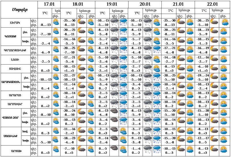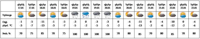 Հունվարի 17-ի ցերեկը, 18-ին, 20-ի ցերեկը, 21-22-ը սպասվում է առանց տեղումների եղանակ: Հունվարի 19-ին, 20-ի գիշերը և առավոտյան սպասվում է ձյուն: