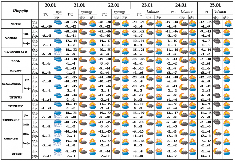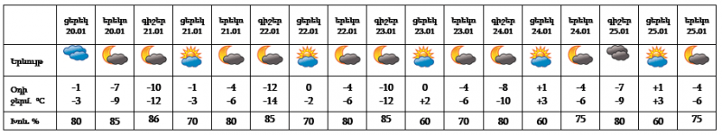 Հունվարի 20-ի ցերեկը առանձին շրջաններում սպասվում է ձյուն և մառախուղ, լեռնային առանձին շրջաններում՝ բուք: Հունվարի 21-25-ը սպասվում է առանց տեղումների եղանակ: