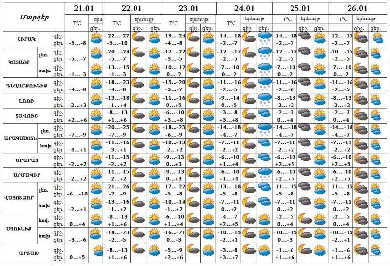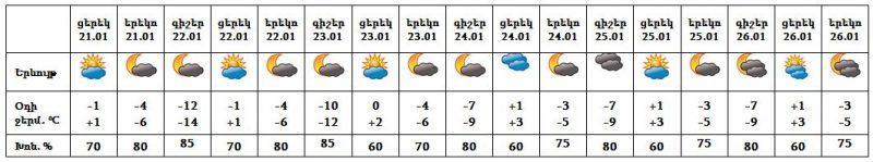 Հունվարի 21-ի ցերեկը, 22-23-ը, 25-26-ը սպասվում է առանց տեղումների եղանակ, 24-ի առավոտյան ժամերին հնարավոր է թույլ ձյուն: