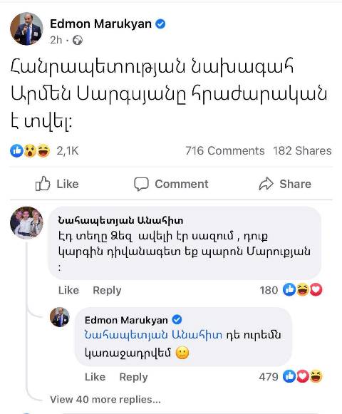 Արմեն Սարգսյանի հրաժարականի մասին ֆեյսբուքյան գրառում էր արել նաև այս պահին ԱՄՆ-ում գտնվող Էդմոն Մարուքյանը: Նրա գրառման մեկնաբանություններում օգտատերերից մեկը գրել էր, որ նախագահի պաշտոնում տեսնում է հենց Մարուքյանին, ինչին ի պատասխան, Մարուքյանը գրել է՝ «Դե ուրեմն կառաջադրվեմ»: