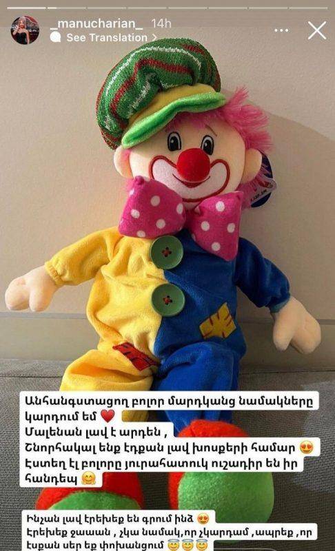 Մալենայի մայրը՝ դերասանուհի Աննա Մանուչարյանը, ևս անդրադարձել է աղջկա առողջական վիճակին. «Անհանգստացող բոլոր մարդկանց նամակները կարդում եմ։ Մալենան լավ է արդեն, շնորհակալ ենք էդքան լավ խոսքերի համար։ Էստեղ էլ բոլորը յուրահատուկ ուշադիր են իր հանդեպ»,- գրել է Մալենայի մայրիկը։