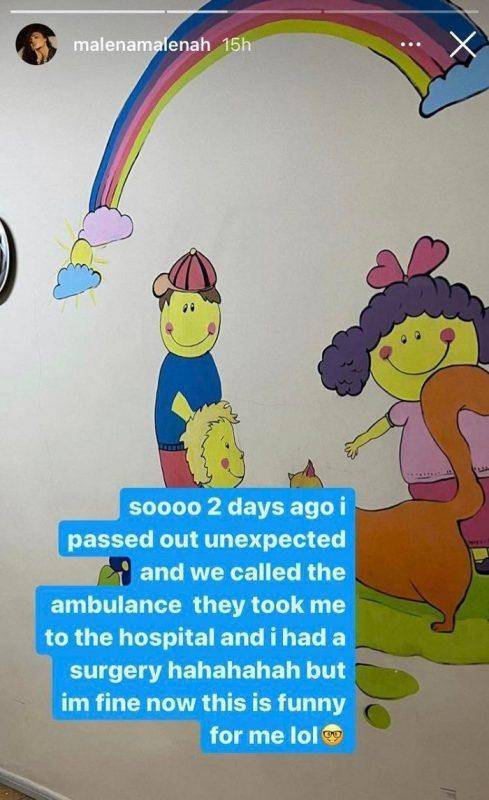 Հրապարակմանը կից Մալենան գրել է. «Երկու օր առաջ անսպասելի կորցի գիտակցությունս, եւ մենք շպատօգնություն զանգեցինք։ Նրանք ինձ հիվանդանոց տեղափոխեցին, եւ ես վիրահատության ենթարկվեցի, բայց հիմա արդեն լավ եմ»: