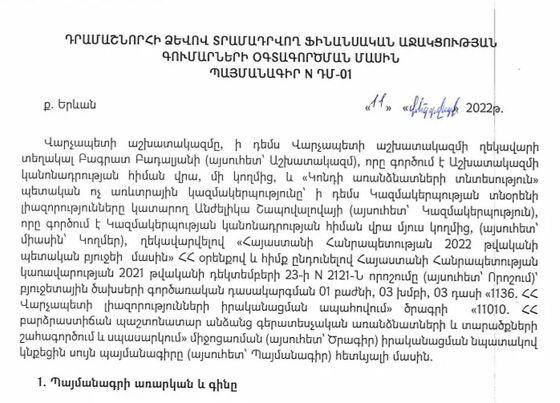 Վարչապետի աշխատակազմը 469 մլն 741 հազար դրամ կամ 978 հազար 600 դոլար դրամաշնորհ է հատկացրել «Կոնդի առանձնատների տնտեսություն» ՊՈԱԿ-ին, որի տնօրենի պաշտոնակատարը Անժելիկա Շապովալովան է։ Շապովալովան ԱԺ ՔՊ-ական պատգամավոր Էդգար Հակոբյանի կինն է, և, ըստ մեր տեղեկությունների, վարչապետի կին Աննա Հակոբյանի հարազատ մորաքրոջ աղջիկը։