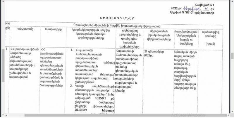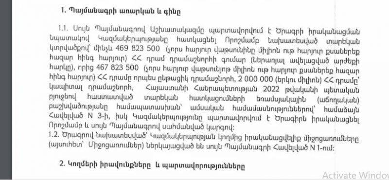 Դրամաշնորհի ակնկալվող արդյունքների և դրանց գնահատման չափանիշների բաժնում ընդամենը գրված է հետևյալը․ «ՀՀ բարձրաստիճան պաշտոնատար անձանց գերատեսչական առանձնատների տարածքների բարեկարգում և բարելավում, խնամք»։ Դրամաշնորհը պատգամավորի կնոջ ՊՈԱԿ-ին տրվել է 1 տարվա գործունեության համար։