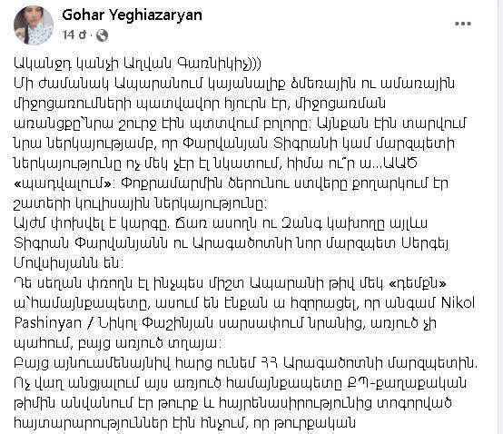 Մի ժամանակ Ապարանում կայանալիք ձմեռային ու ամառային միջոցառումների պատվավոր հյուրն էր, միջոցառման առանցքը՝նրա շուրջ էին պտտվում բոլորը։ Այնքան էին տարվում նրա ներկայությամբ, որ Փարվանյան Տիգրանի կամ մարզպետի ներկայությունը ոչ մեկ չէր էլ նկատում, հիմա ու՞ր ա…ԱԱԾ «պադվալում»։