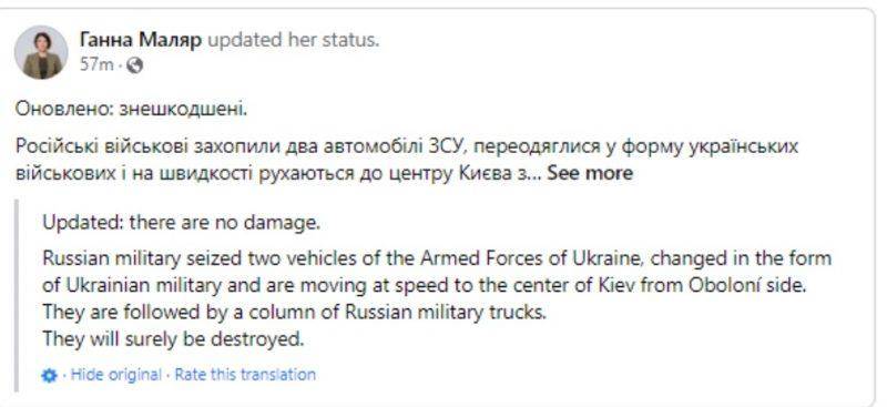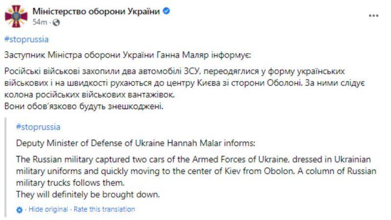 Հաղորդագրությունում մասնավորապես ասվում է, որ ռուսական բանակը գրավել է Ուկրաինայի զինված ուժերի 2 մեքենա և շարժվում են դեպի մայրաքաղաք: