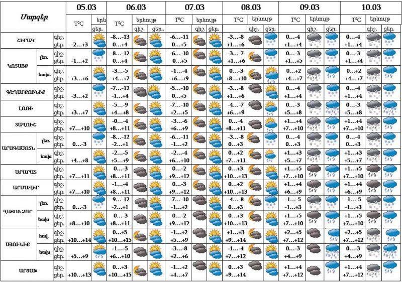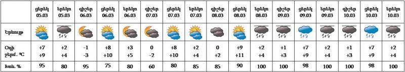 Մարտի 5-ի և 8-ի երեկոյան ժամերին քաղաքի առանձին հատավածներում հնարավոր է թույլ անձրև, 6-7-ը և 8-ի գիշերը սպասվում է առանց տեղումների եղանակ։ Մարտի 9-10-ը ժամանակ առ ժամանակ սպասվում է անձրև։
