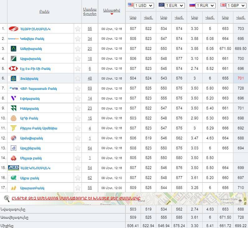 Հայաստանի բանկերի կողմից գնվող և վաճառվող արտարժույթների փոխարժեքները մարտի 8-ի դրությամբ՝ ըստ rate.am-ի: